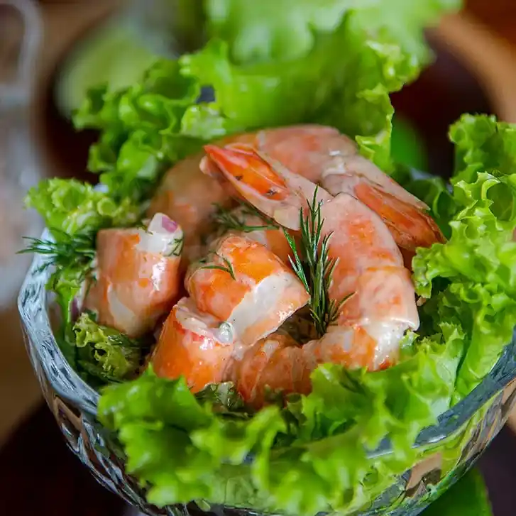 Prawns served with lettuce and covered with deliciously tangy cocktail sauce.